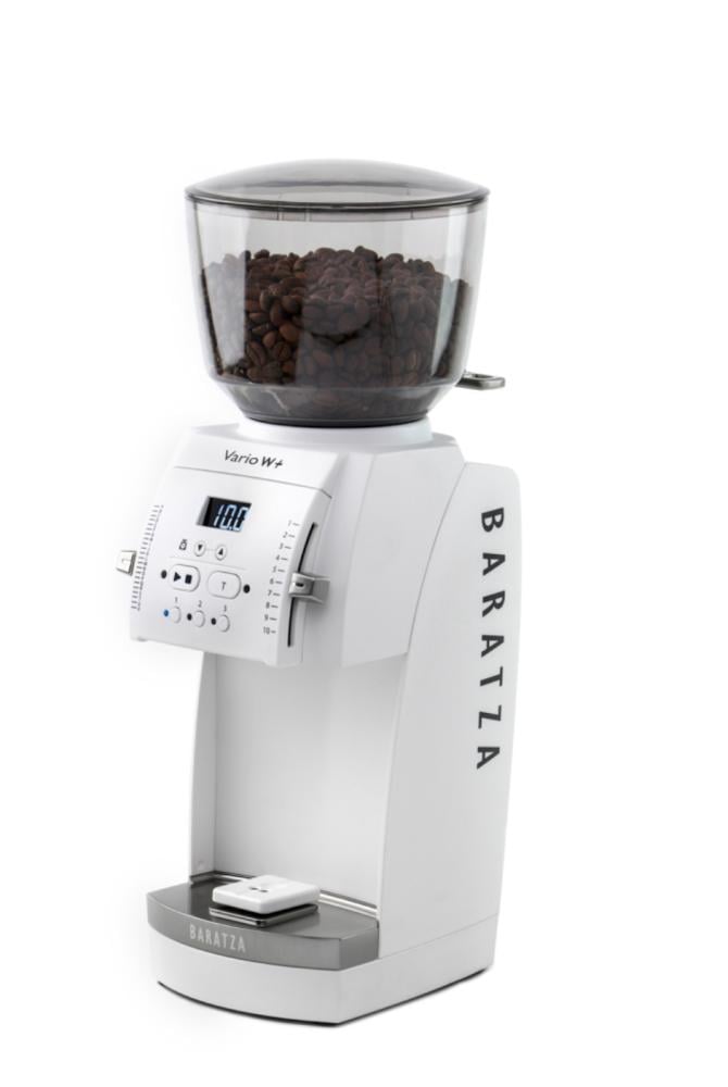 طاحونة فاريو دبليو + من شركة باراتزا تمتاز بتروس من الفولاذ بمقاس 54مم مسطّحة وبخاصية الطحن بالوزن مناسبة للإسبرسو وهي أيضا مناسبة لترشيح القهوة المقطرة